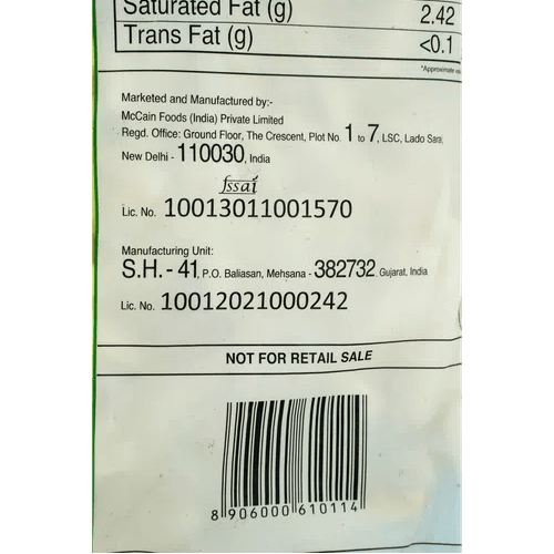 - मुख्य घटक: बटाटा (९२%) आणि पामोलिन तेल